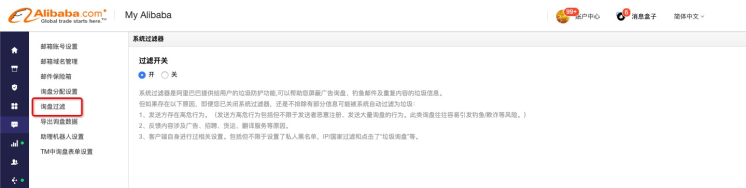 系統(tǒng)會根據(jù)發(fā)件人、主題、詢盤內(nèi)容等綜合信息進行判斷識別,自動過濾帶有特殊的敏感字眼、廣告行為等的詢盤,您可以在【My Alibaba左側(cè)菜單——商機溝通——設置——詢盤過濾——系統(tǒng)過濾器】頁面開啟或關閉該功能