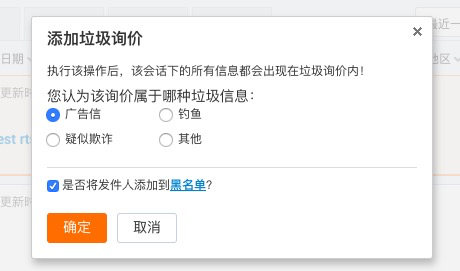 商機列表頁及商機詳情頁均有添加垃圾詢價入口,選擇對應的類型舉報即可,同時可以選擇是否將該收件人加入黑名單